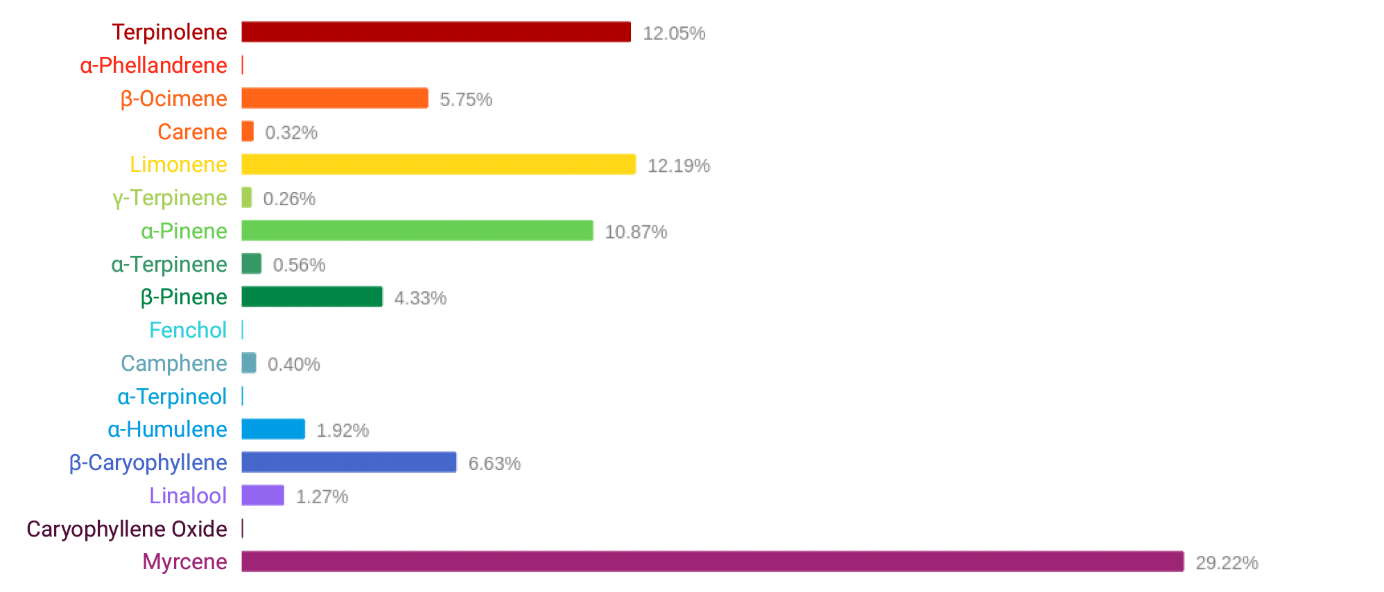 - Terpinolene (12.05%): Adds a complex, multi-faceted aroma with notes of citrus, pine, and floral, known for its uplifting and refreshing effects.