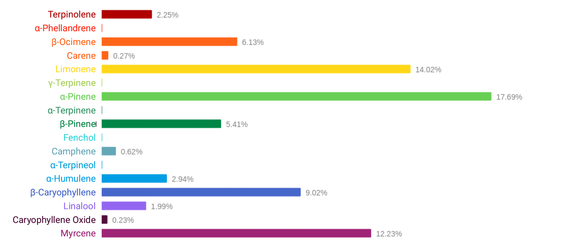 - Myrcene (12,23%): Adds musky, earthy undertones and is known for its relaxing effects.